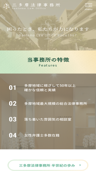 99%三多摩法律事務所は、東京都立川市において、1967年の設立以来50年以上にわたり、地域の方々の信頼を得て法律相談や事件活動に取り組んできました。現在は、弁護士20名、事務局12名となり、三多摩地域で最大規模の総合法律事務所です。