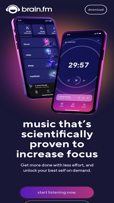 85%Use Brain.fm's functional music to help you focus relax and sleep better, using cutting edge neuroscience to get results.