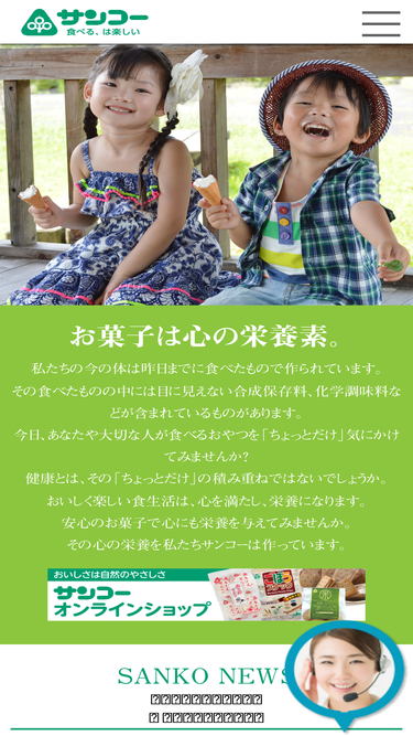 86%バウムクーヘン、多種スナック、ビスケット類、チョコレート、ゼリーの菓子等、健康志向菓子の製造販売。株式会社サンコーが運営。