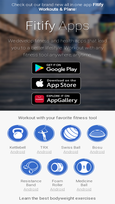 fitify apps is a collection of fitness apps for android and ios that lead you to a better lifestyle. workout with any fitness tool anywhere, anytime. kettlebell, trx, swiss ball, foam roller, bosu and more.