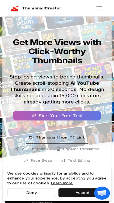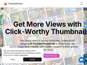 68%Generate eye-catching YouTube thumbnails with AI. Face-aware generation, style cloning, and instant variations. Boost your click-through rates with ThumbnailCreator.com.