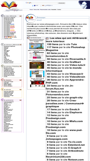 100%bienvenue sur www.joliespages.com. annuaire des très beaux sites classés par couleurs dominantes avec une copie d'écran. une recherche plus avancée vous permet de trouver des sites par différents critères (médias, présentations, langues...). des tutoriaux photoshop, des astuces, des dossiers sont également disponibles.