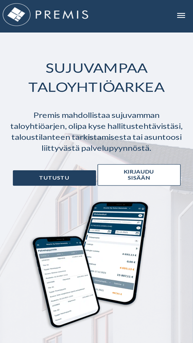 92%SUJUVAMPAA TALOYHTIÖARKEA Premis mahdollistaa sujuvamman taloyhtiöarjen, olipa kyse hallitustehtävistäsi, taloustilanteen tarkistamisesta tai asuntoosi liittyvästä palvelupyynnöstä. Tutustu Kirjaudu sisään Helppoa ja läpinäkyvää Asuntoosi liittyvän asian hoitaminen onnistuu helpoimmin Premistä hyödyntämällä. Löydät palvelusta vastaukset muun muassa moniin talouteen liittyviin kysymyksiin. Tarvittaessa Premis huolehtii käsittelyä vaativat asiat välittömästi oikealle taholle hoidettavaksi ja pitää sinut ajantasalla asian edistymisestä.