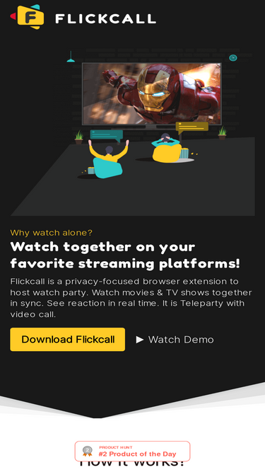 85%FlickCall is a best way to watch movie & TV shows together on popular streaming services. Everyone enjoys same scene at same time. It is Teleparty with video call & group chat. Netflix watch party with video call. Disney watch party.