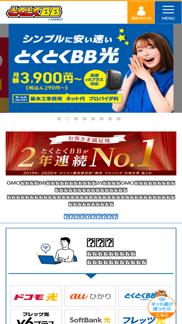 80%「GMOとくとくBB」はGMOインターネット株式会社が運営しているインターネットサービスプロバイダーです。ドコモ光、auひかり、GMO光アクセスなどの光回線やWiMAXなどのインターネットサービスをおトクな価格と充実したサポートサービスで提供いたします。