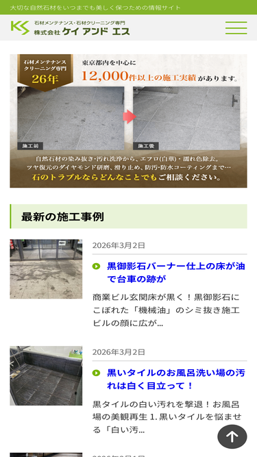 石材クリーニングについてのよくあるご質問。株式会社ケイ・アンド・エスは石材メンテナンス専門で26年!シミ抜きなどのトラブル対応からコーティング、改修工事まで、12,000件を超える現場経験とプロの専門技術で対応します。