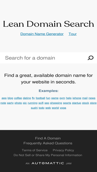 100%What is Lean Domain Search? Lean Domain Search is a fast search engine for finding available .com and .blog domain names. We help you find domain names by pairing your search phrase with other keyw…