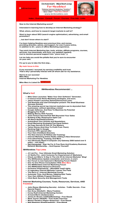 free internet marketing, online business start up strategy and research advice for newbies, more. learn how to make money on the net. mike merz, admin.