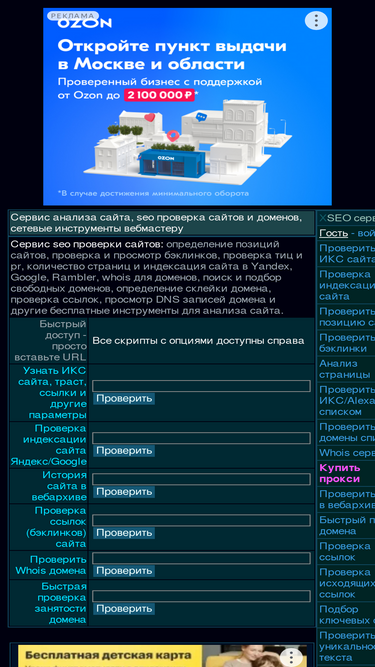 97%seo анализ сайта, проверка сайтов, узнать позиции сайта , проверка индексации сайтов в яндекс и google, определение тиц и икс, проверка доменов, whois, просмотр и проверка dns, инфо по ip и проверка на спам . seo инструменты для вебмастера.