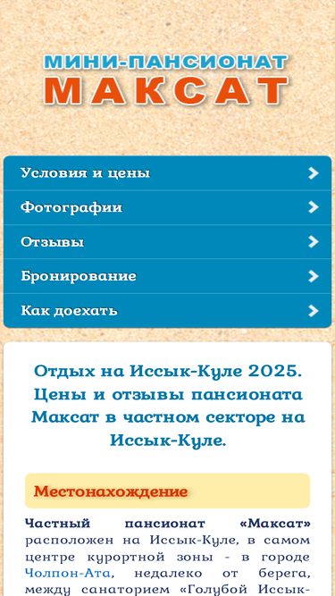 Мини-пансионат «Максат» на Иссык-Куле находится в частном секторе города Чолпон-Ата и предлагает туристам гостиничные услуги в летнее время. Для гостей созданы все условия: уютные номера со всеми удобствами, охраняемая и закрытая от посторонних лиц территория, озелененный двор, два бассейна, детская площадка, собственная столовая, бесплатная парковка и интернет.
