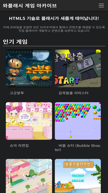100%욘플래시 게임 아카이브 사이트는 사라진 플래시게임들을 모아두고 HTML5 웹브라우저를 사용할 수 있는 공간입니다. 플래시게임 및 애니메이션 콘텐츠를 PC 데스크탑, 태블릿, 모바일 같은 모든 브라우저에서 실행할 수 있고, 플래시게임들을 보존하기 위한 커뮤니티 공간입니다.