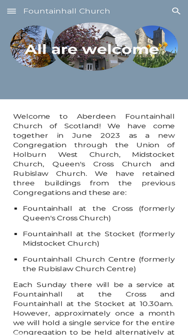 99%welcome to aberdeen fountainhall church of scotland! we have come together in june 2023 as a new congregation through the union of holburn west church, midstocket church, queen's cross church and rubislaw church. we have retained three buildings from the previous congregations and these