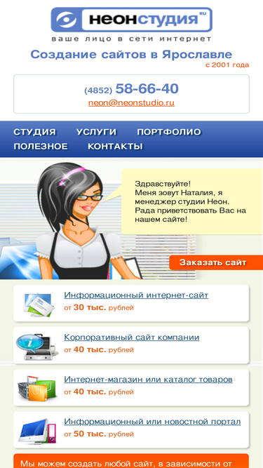 88%создание сайтов в ярославле, стоимость сайта от 15 тыс. рублей. студия неон: создание адаптивных сайтов, web-дизайн, программирование, регистрация доменных имен, хостинг, раскрутка и продвижение сайтов.