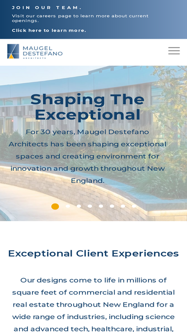 100%Residential | Latest company and project news from Maugel DeStefano Architects. 2023 Architectural Firm of the Year. Maugel DeStefano Architects shapes exceptional spaces and creates environments for innovation and growth. Our designs come to life in millions of square feet of commercial real estate throughout New England for a wide range of industries, including science & technology, healthcare, industrial, multifamily, commercial, and custom residential.