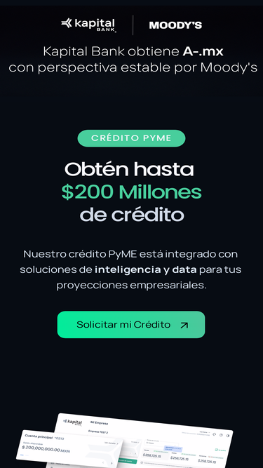 79%Impulsa el crecimiento de tu empresa con Kapital. Solicita crédito, cobra más rápido, paga a tiempo, visualiza y automatiza tu operación, abre tu cuenta de banco e invierte, todo en un solo lugar.