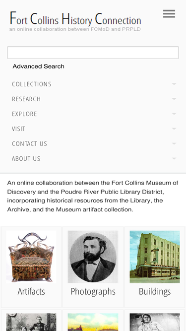 76%an online collaboration between the fort collins museum of discovery and the poudre river public library district. consisting of a database of over 100,000 items including historical photographs, maps, scanned city directories, transcripts and audio versions of oral histories, indexes, and browsable topics of historical interest.