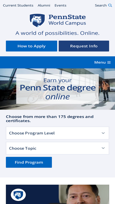 100%earn your penn state degree online. penn state world campus offers accredited online college degrees and certificate programs. learn more about our online undergraduate and graduate programs.