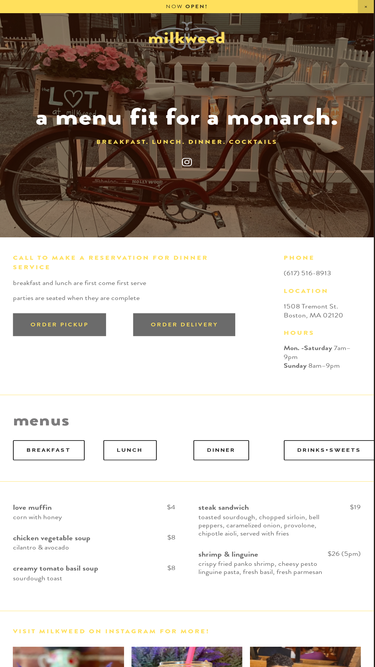 98%Discover Milkweed's diverse menus for breakfast, lunch, dinner, and cocktails at our Dorchester and Mission Hill locations. Reserve your spot now.