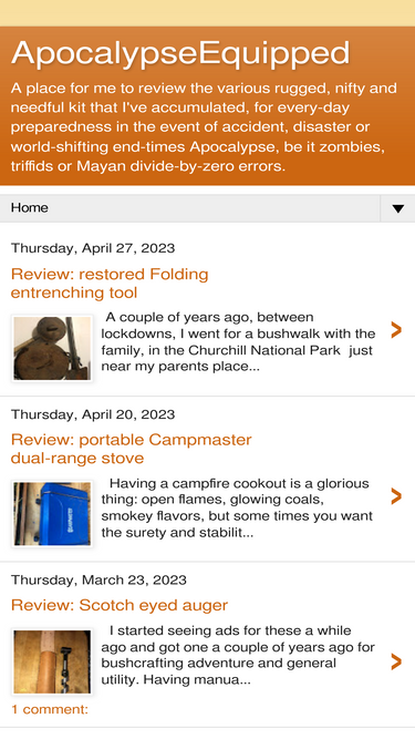 Reviews for various rugged, nifty and needful gear, tools and kit, in the event of accident, disaster or Apocalypse: zombies, triffids or Mayan errors