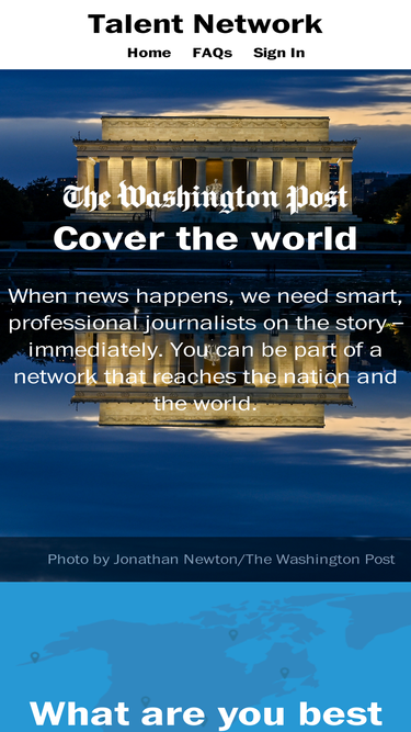 68%the washington post talent network is the platform editors and freelancers use to collaborate together for assignments. our aim is to open up the newsroom to more ideas for news coverage from across the country and the world, and more easily locate the best freelance talent when breaking news occurs outside of washington.