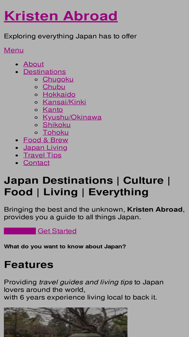 72%Kristen Abroad covers everything about Japan with 6 years experience and travels to all 47 prefectures. Itineraries, food, etiquette, travel, living and more!