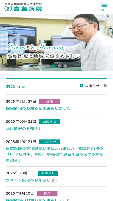 広島県広島市中区の病院「国家公務員共済組合連合会 吉島病院」のwebサイトです。呼吸器センターや健康管理センター(人間ドック)、専門外来、訪問看護など、高度で安全な医療の提供と、地域に根ざした親しまれる病院を目指しております。