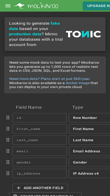 90%a free test data generator and api mocking tool - mockaroo lets you create custom csv, json, sql, and excel datasets to test and demo your software.