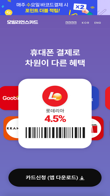 79%휴대폰 결제, 계좌이체 등 다양한 결제수단으로 모빌리언스카드에 충전하여 전국 어디서나 사용할 수 있는 카드입니다. 지금 바로 발급 받아 보세요.