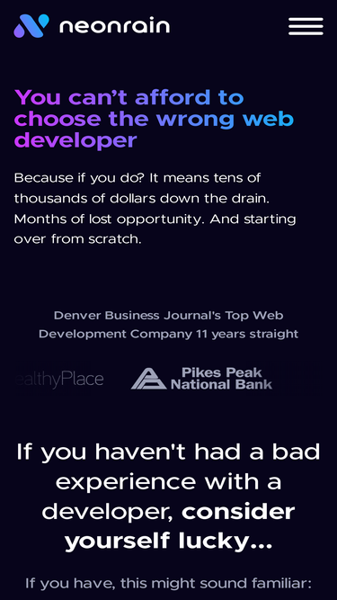 100%Founded in 2002, Neon Rain is a top-rated Denver Web Design Company. We specialize in website design, mobile apps, and eCommerce development. Call today 303-957-3092