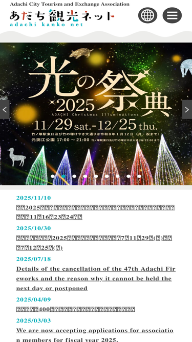 100%Adachi-ku, Tourism Exchange Association operated "Adachi tourism Net" is the official website that transmits the event and tourist information of Adachi-ku. Such as the convenient town of event information to the gourmet information and weekend outing in Adachi Ward, it will deliver the information of seasonal town.