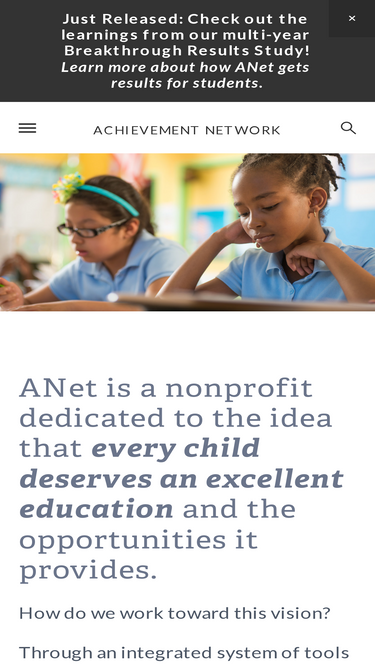 80%The Achievement Network (ANet) helps schools boost student learning with great teaching informed by data, state standards and proven practices. Learn more.