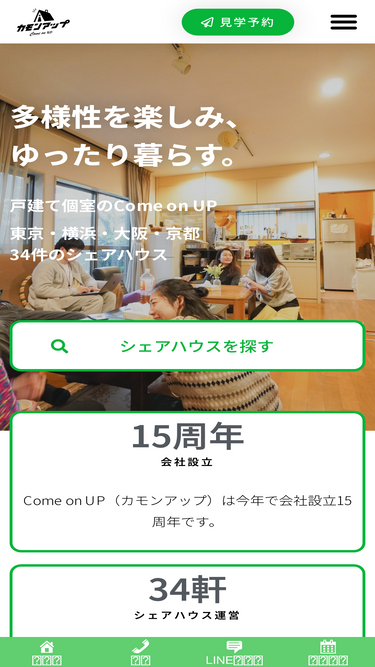 54%東京・横浜・大阪・京都で32軒のシェアハウスを運営するcome on up(カモンアップ)のホームページです。