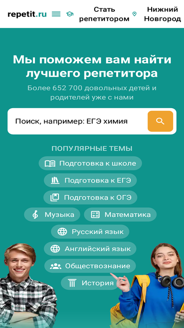 85%найдите хорошего репетитора по любому предмету на repetit.ru. более 149 900 преподавателей готовы помочь с подготовкой к экзаменам и улучшением знаний. удобный поиск, занятия онлайн и очно. средняя стоимость занятий - 1500 рублей в час.