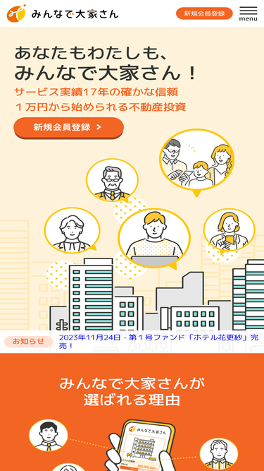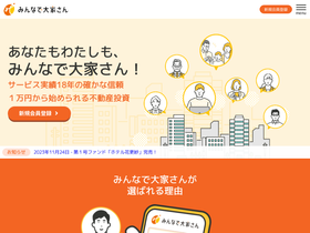みんなで大家さん公式ウェブサイトです。みんなで大家さんは不動産特定共同事業法に基づく不動産ファンドです。100万円から不動産投資に参加でき、安定した利回り、安全性を高めた資産運用商品を目指しています。