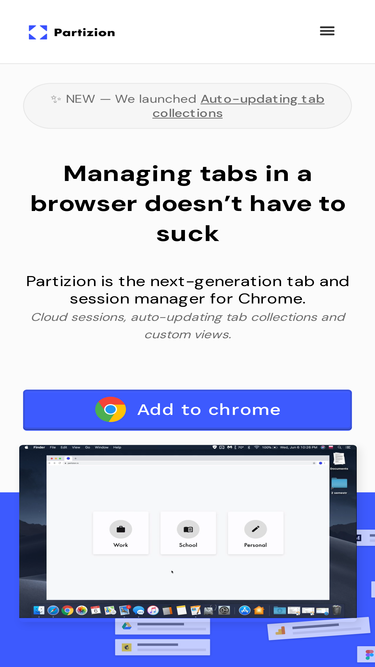 100%Partizion is a small startup on a mission to make working the browser productive, organized, and delightful. Supporting Partizion is supporting the development of the best way to work in the browser. Partizion is a tab manager, bookmarks organizer, and personal/collaborative space to work in the browser.