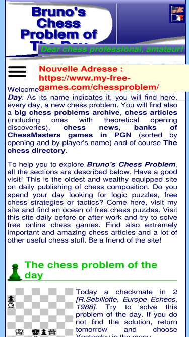 100%everyday you'll find new free chess problems on bruno's chess problem of the day. come on and find my free online chess games. i aggregate for you all chess news and offer you grandmaster pgn games.