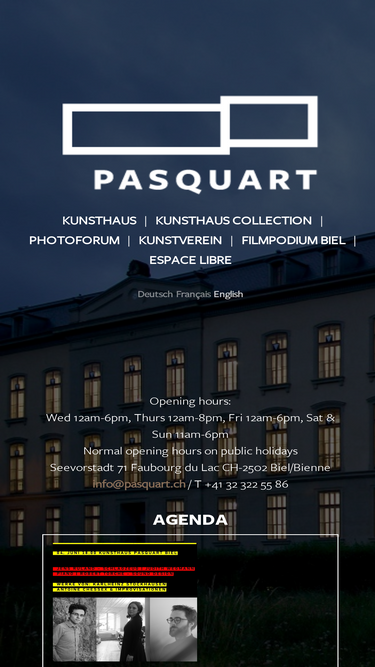 69%Öffnungszeiten: Mi 12:00-18:00, Do 12:00-20:00, Fr 12:00-18:00, Sa & So 11:00-18:00 An Feiertagen gelten die normalen Öffnungszeiten. Seevorstadt 71 Faubourg du Lac CH-2502 Biel/Bienne info@kbcb.ch / T +41 32 322 55 86 AGENDA