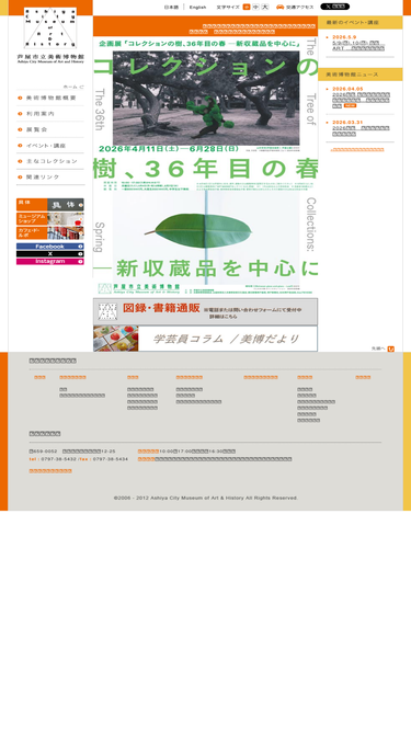 100%芦屋市立美術博物館公式サイト。展覧会やイベント情報、貸し施設案内をお知らせいたします。主なコレクションとして、具体美術協会、小出楢重、吉原治良、田中敦子の作品を 所蔵しています。