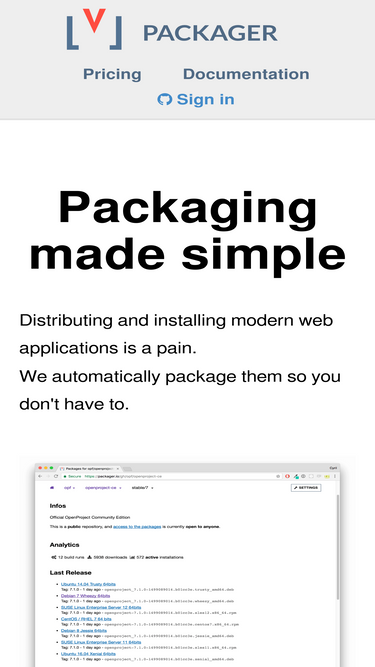 91%Packaging and distributing modern web applications is a pain. Packager automatically builds debian or rpm packages from your git repository.