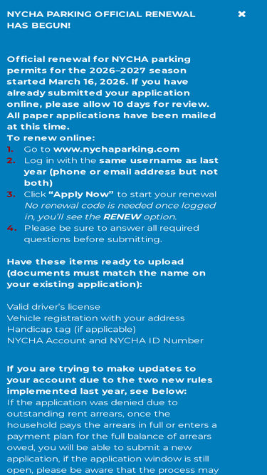 100%explore the new york city housing authority (nycha) parking website for information about permit fees, parking regulations, towing and more.