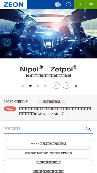 88%日本ゼオン株式会社の公式ウェブサイトです。日本ゼオンは、自動車用タイヤなどの合成ゴムや高機能樹脂の製造・開発を中心に事業を行う化学メーカーです。世界に誇り得る独創的技術により、地球環境と人類の繁栄に貢献してまいります。