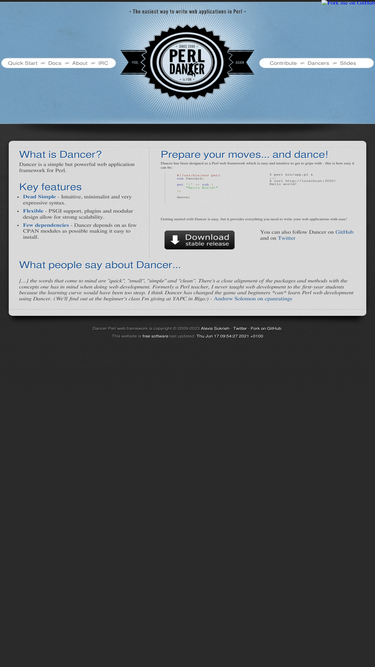 74%perldancer is a micro perl web framework designed to be as effortless as possible for the developer. with perldancer, web development is fun again. it's a very expressive dsl for writing web applications with tons of plugins and a very dynamic community.