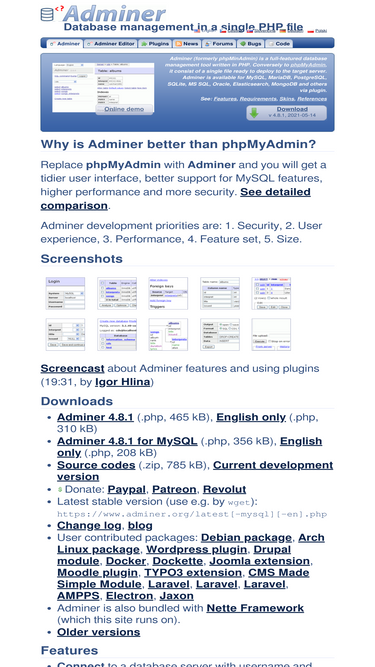 72%adminer (formerly phpminadmin) is a full-featured database management tool written in php. conversely to phpmyadmin, it consist of a single file ready to deploy to the target server. adminer is available for mysql, mariadb, postgresql, sqlite, ms sql, oracle, elasticsearch, mongodb and others via plugin.