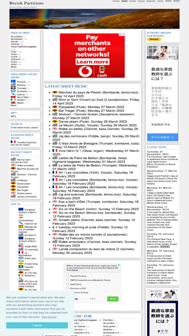 free sheet music and free mp3 of celtic music (scottish music, irish music) and world music for violon, flute, scottish bagpipes, piano and guitar to download