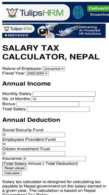 92%salary tax calculator is for calculating tax payable to nepal government on the salary you earn in a given year.