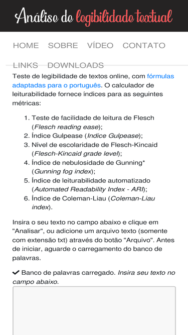 88%site dedicado a fornecer índices de legibilidade para textos na língua portuguesa, tomando por base fórmulas adaptadas para o português.