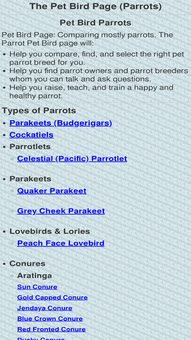 99%parrot comparison, and help finding right parrot breeds. comparing grey, love bird, cockatiel, parakeets, budgies, conure, sun, jenday, mollucan, cockatoo, sulfer, quaker, eclectus, and other parrots