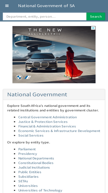88%explore south africa’s national government and its related institutions and entities by government cluster: central government administration, justice & protection services, finance & administration services… or explore by entity type: parliament, presidency, national departments…