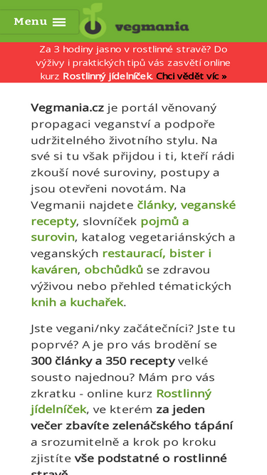 Na Vegmanii najdete přes 250 článků, 350 receptů, mapu vegetariánských a veganských restaurací, bister i kaváren a obchůdků se zdravou výživou.