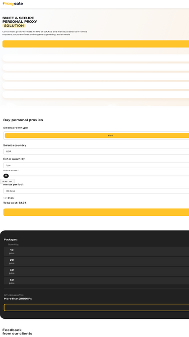 55%at proxy-sale.com you can buy ipv4 and ipv6 proxies with http(s) and socks5 support with high speed, stable operation, and round-the-clock technical and customers support. by purchasing private proxies from us service, you will receive ip addresses from a reliable proxy provider from around the world